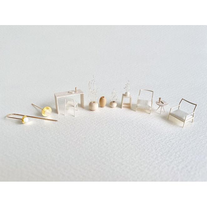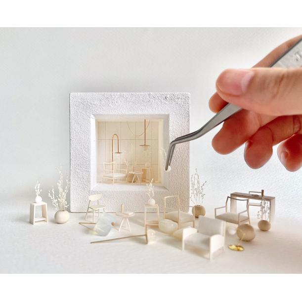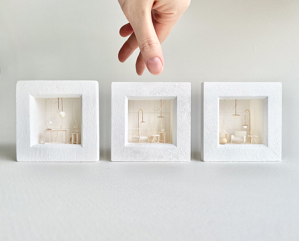 小さなフレームの中に1/50サイズの建築模型家具をディスプレイして、額装された小さな部屋をつくります。