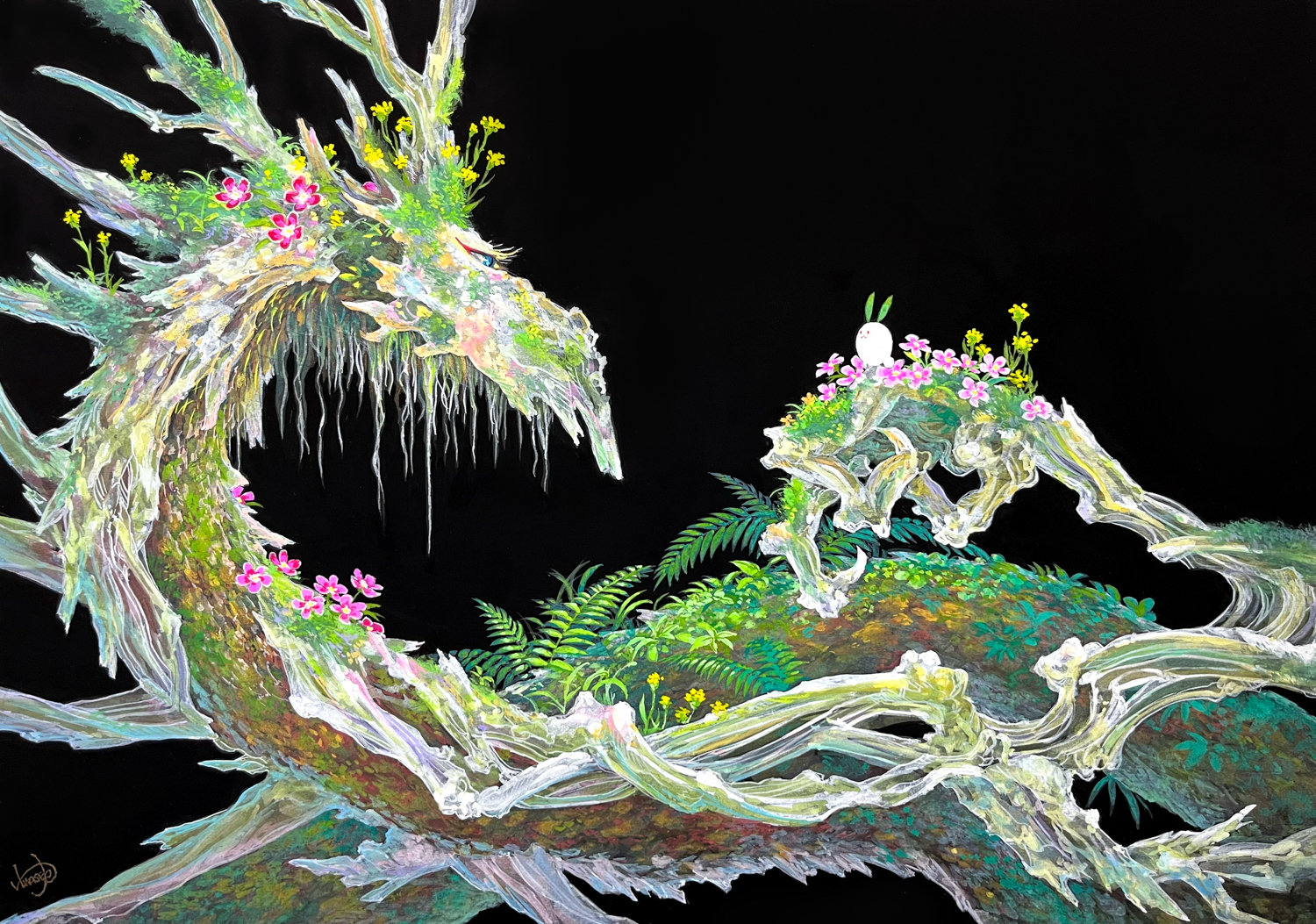 大きな龍と、小さな妖精(ちょこん)が見つめあっています。お互い、人間のように言葉で会話するわけではありませんが、どこか通じるものを感じています。